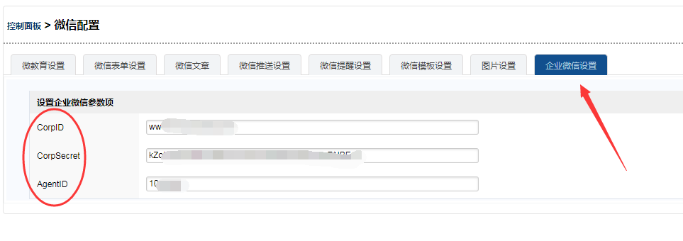 * 进入CRM系统---控制面板---微信配置---企业微信设置