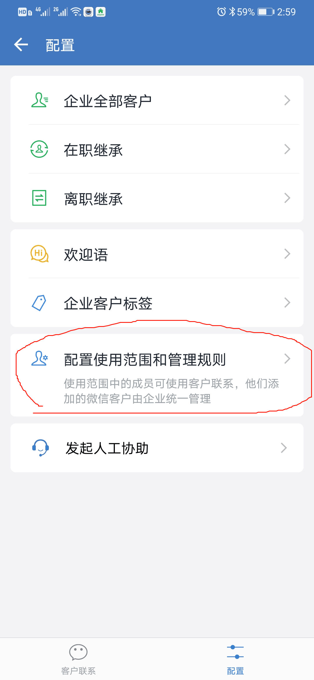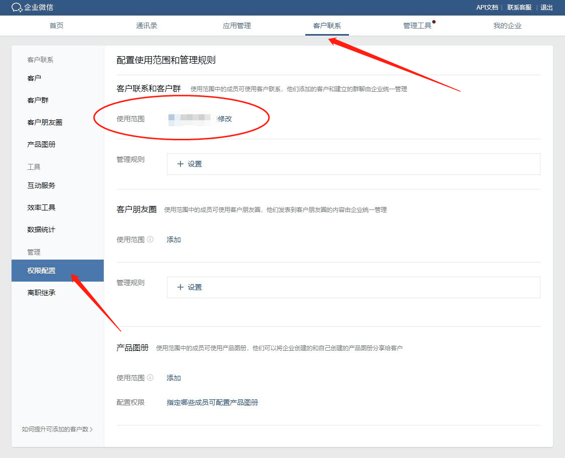 工作台---客户联系---下拉右下角(配置)---配置使用范围和管理权限