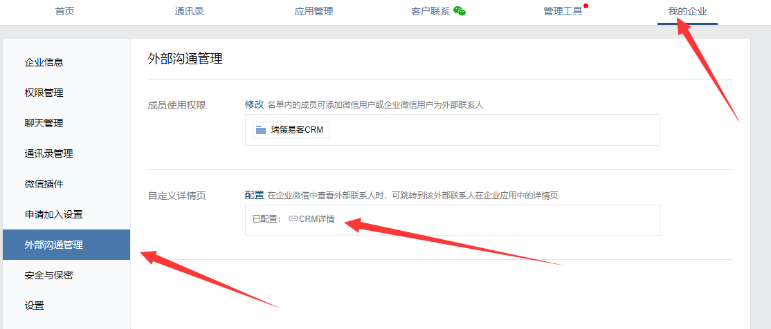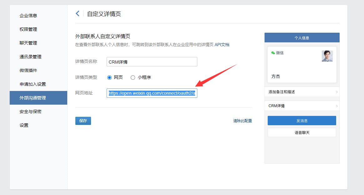 ### 设置企业微信与CRM系统对话入口,设置如下