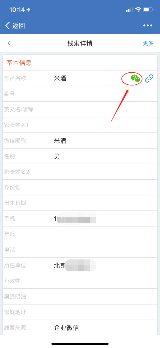 设置成功之后点击客户头像通过客户详情可直接进入CRM客户详情信息,同样,从CRM系统选择对应联系人可跳转到微信聊天界面