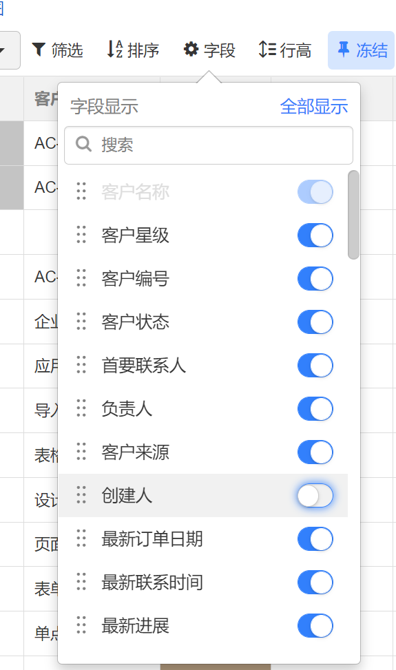 字段这里选中的字段将在列表显示;通过拖动字段名称前面的调整显示顺序。