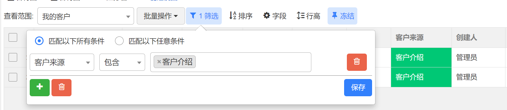 在筛选里面可以通过字段查询到需要的内容;筛选条件保存即为该视图条件。