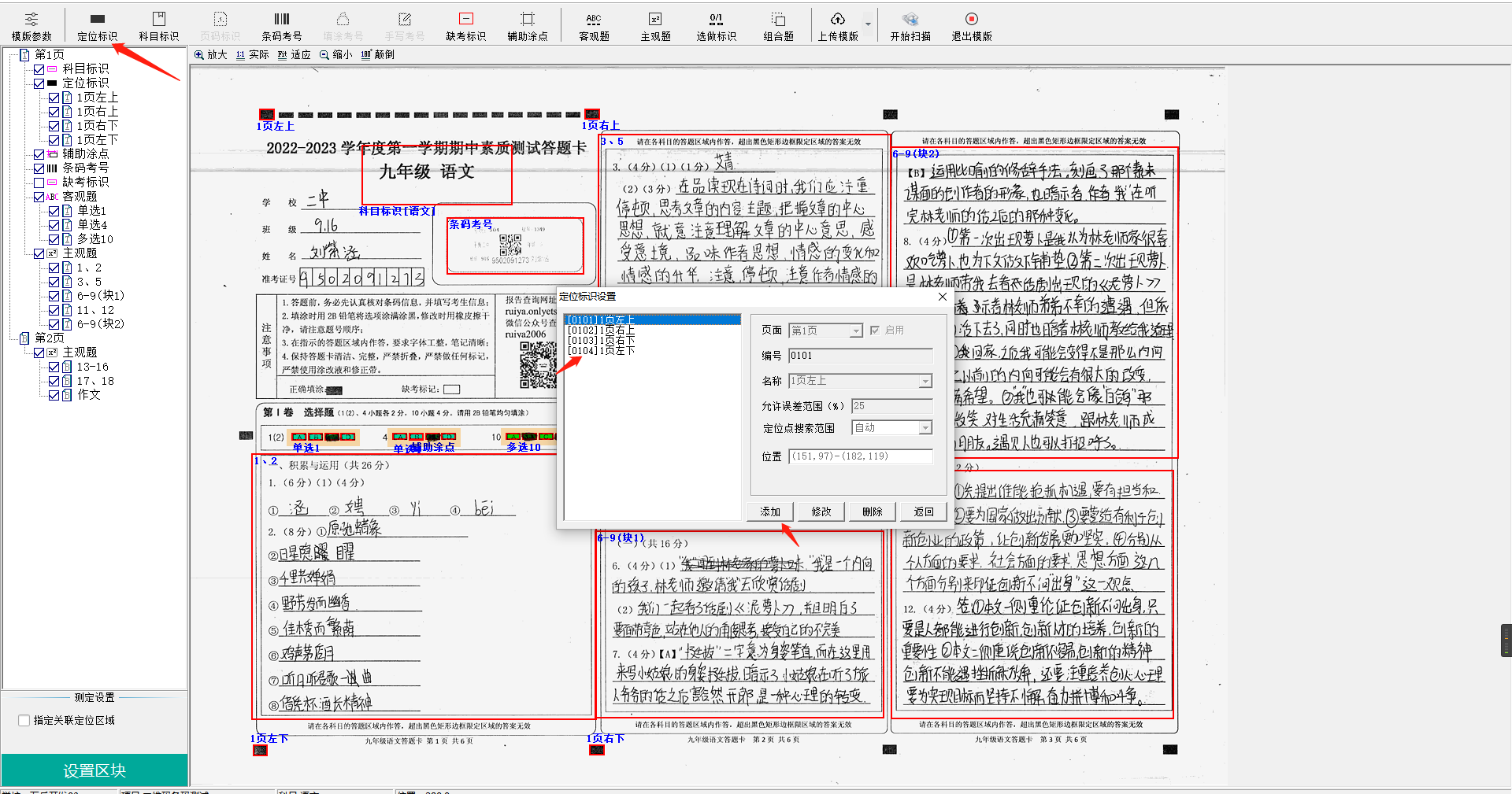 默认展示第一页的定位点,如果第二页新增选做题或客观题自动生成第二页定位点