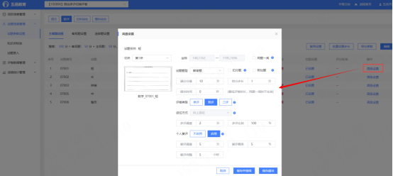 点击【高级设置】,进入高级设置配置页面,除了可以设置满分,给分步长,评卷类型,还可以设置复评(把已经批阅过的试卷再次分给老师进行第二次批阅,组长可以查看该老师两次批阅的一致性,复评不影响分值),如图所示。
