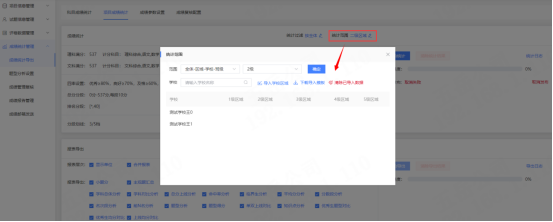 统计范围:默认为全体\-学校-班级;可以切换为全体-区域-学校-班级,需选择要设置的区域层级,包含1-5级,分别对应导入区域时校验的层级数量。