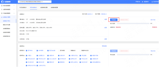 【成绩统计导出】\-【项目成绩统计】科目成绩统计完成后,在此界面统计项目成绩,可以根据需求设置相应的参数,修改完后点击【确定】,设置完成后,点击右边的【开始统计】按钮进行统计成绩,百分比会随着统计变化如图所示。