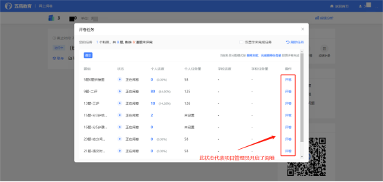 注意:评卷任务中【评卷完成】状态,表示:扫描完已上传试卷,并且也创建了评卷数据,也分配了评卷任务,评阅完的试卷数据,在没有停止评卷时,都能进入回评,如图所示;