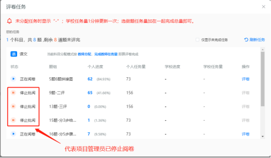 项目管理员在【考试管理\-评卷数据管理-评卷进度控制】中,停止试题阅卷后,评卷老师登录,打开【网上评卷】模块,在【评卷任务】项目列表,点击【开始阅卷】按钮,打开评卷任务弹窗,如图所示:
