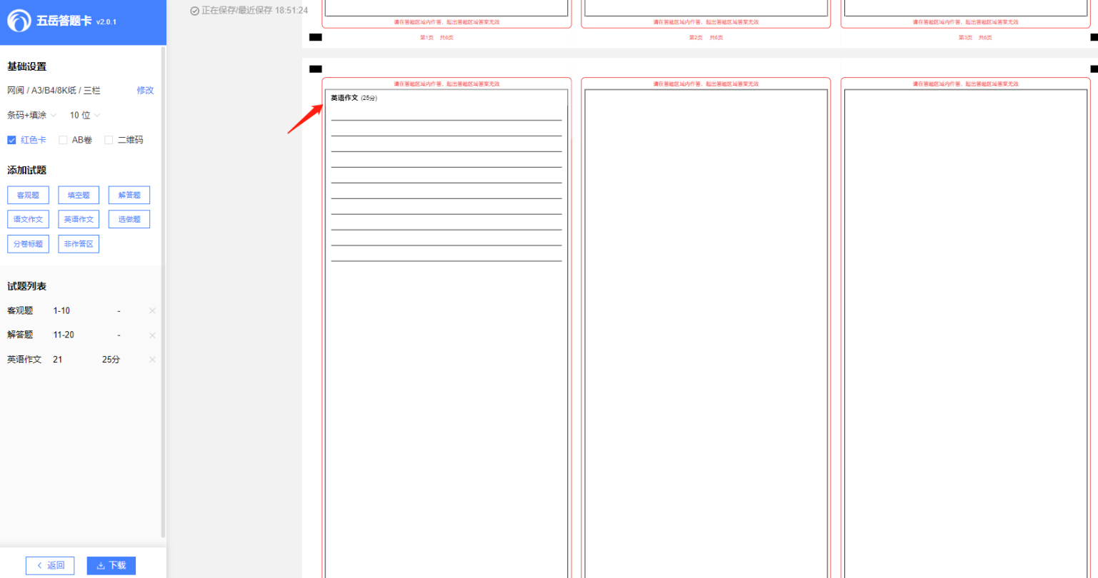 2.预览效果,英语作文支持区域大小拖拽,通过编辑器自行插入横线,也支持一键到底的功能,如果横线不够的话可以复制已经添加的横线;