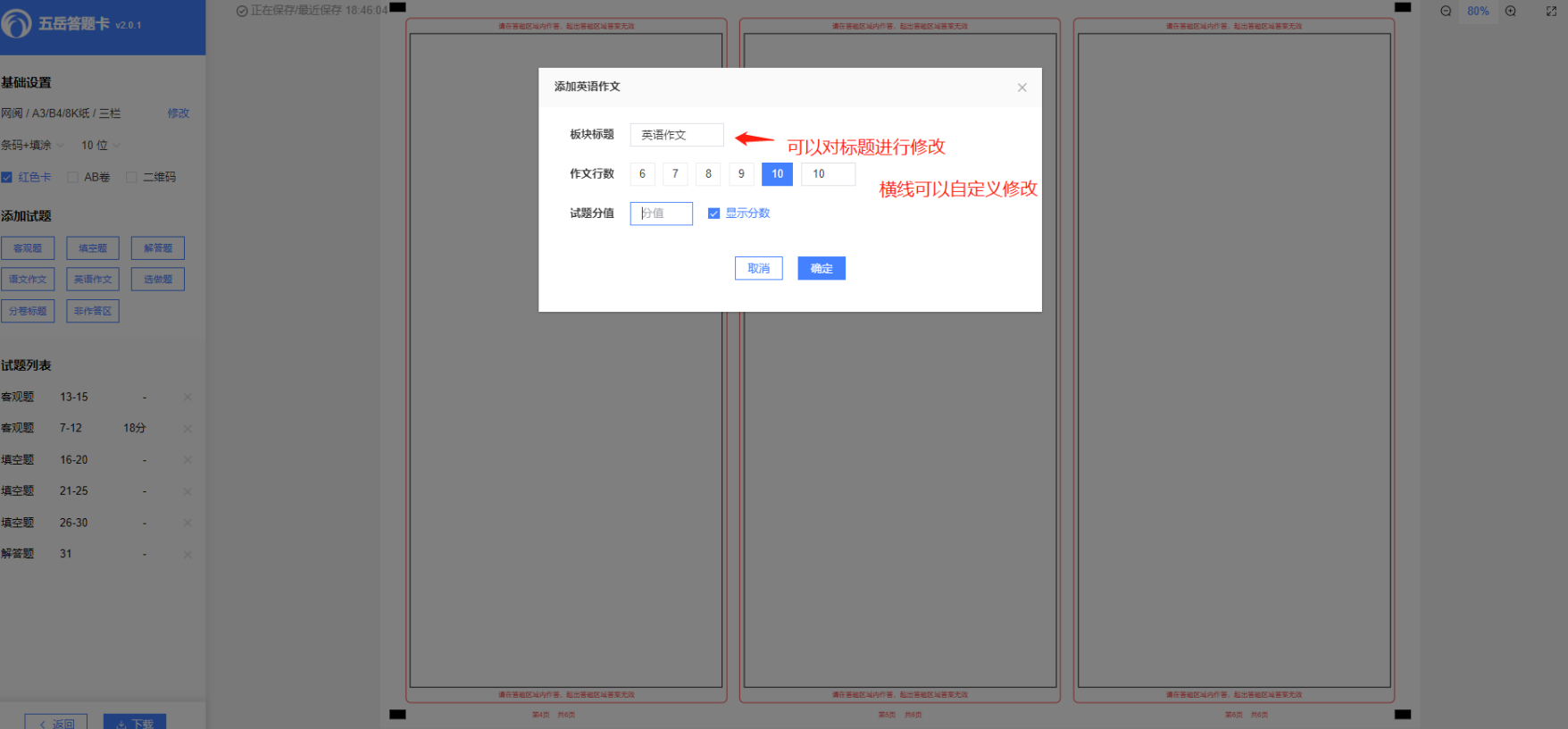 1.英语作文需要自行自定义输入行数,可以对标题进行修改