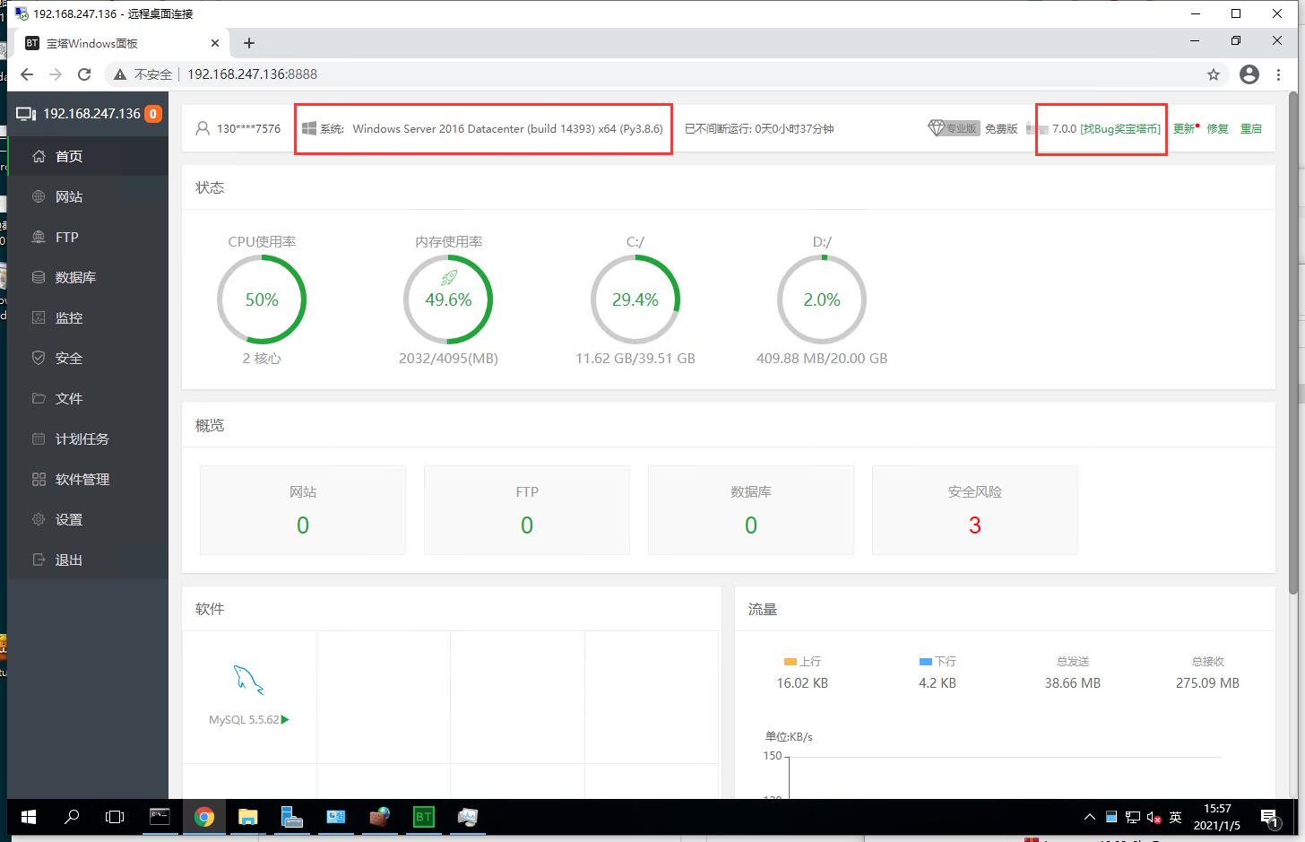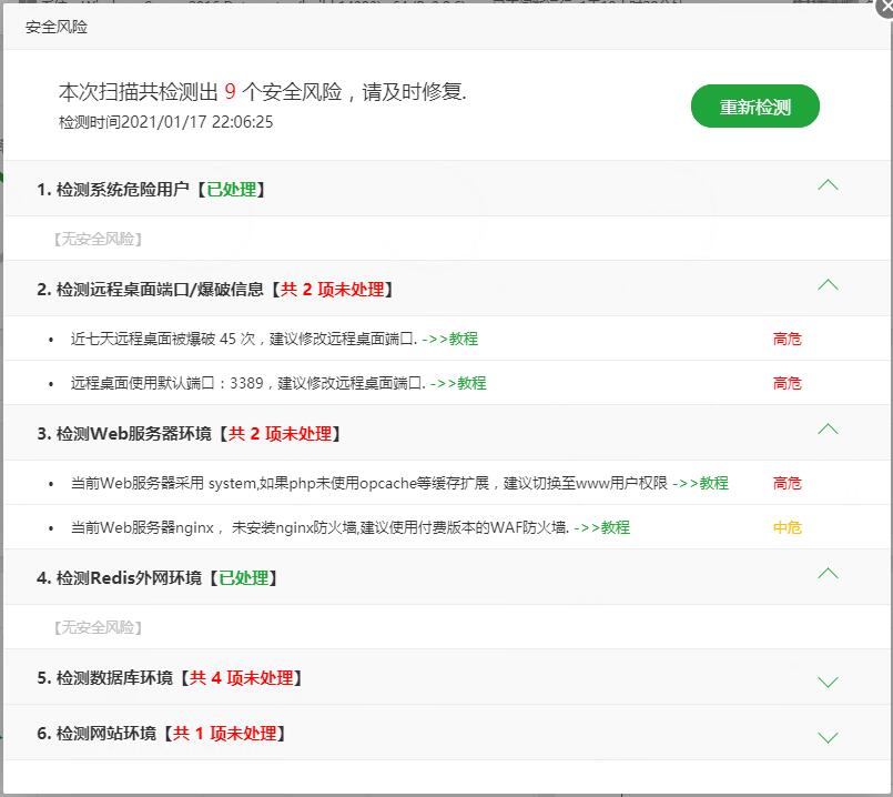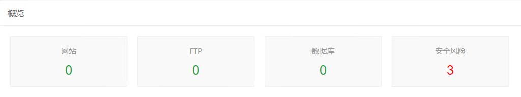 >概览处显示网站数量、FTP数量、数据库数量以及检测到的安全风险数量。