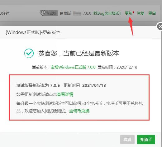 >面板首页右上角可以进行主面板程序更新,同时可以更新至测试版。小贴士:更新测试版可以获得宝塔币哦,宝塔币可以兑换丰厚礼品,包括专业/企业版等增值版本兑换;生产环境不建议更新。