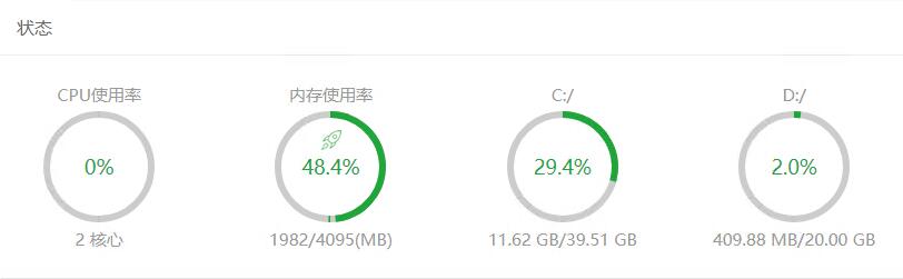>服务器状态。小贴士:鼠标点击内存区域可以释放内存,鼠标放在CPU上可以显示部分信息。