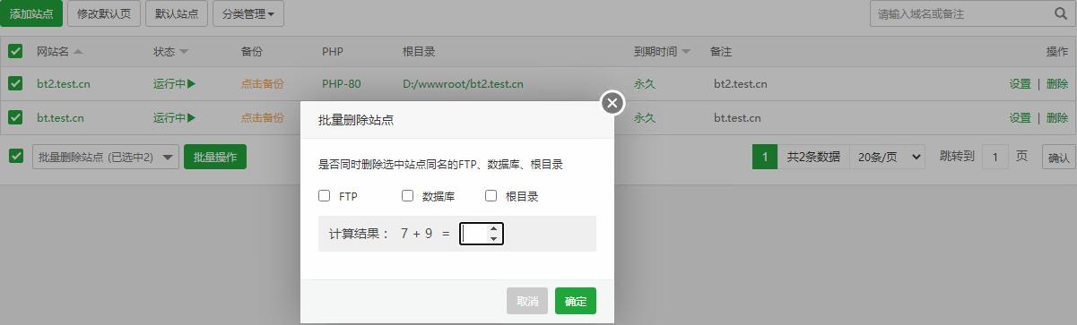 >[warning]小贴士:删除站点时不要勾选上FTP、数据库、根目录就不会删除数据。