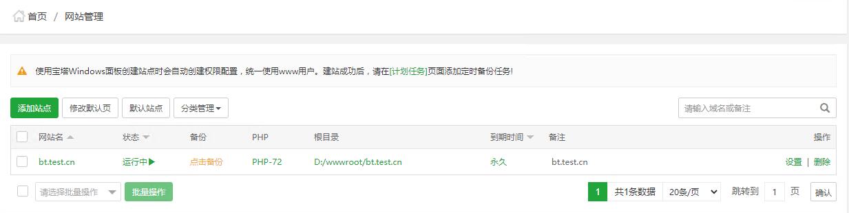 >[danger]堡塔安全提醒您⚠:使用宝塔Windows面板创建站点时会自动创建权限配置,统一使用www用户。建站成功后,请在计划任务页面添加定时备份任务!