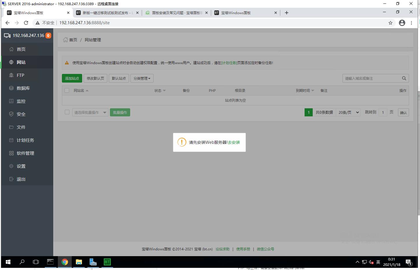 >如果未在首页选择套件安装,打开网站管理页面出现下面的提示,请点击“去安装”前往软件管理页面,根据实际使用需求安装对应的web服务器。以下环境3选1(推荐IIS,不支持多web服务安装)。
