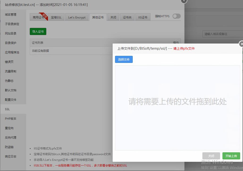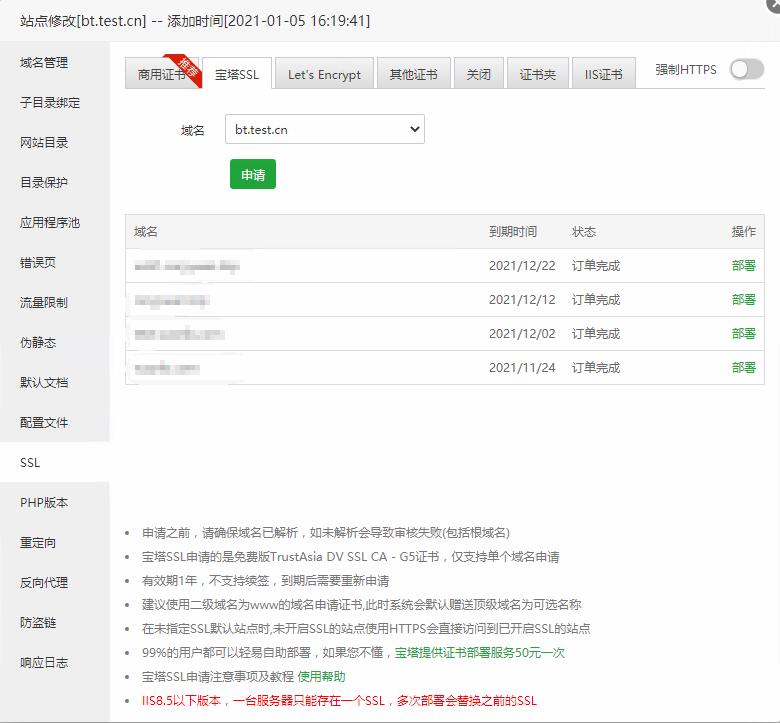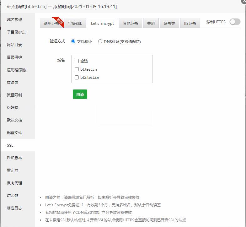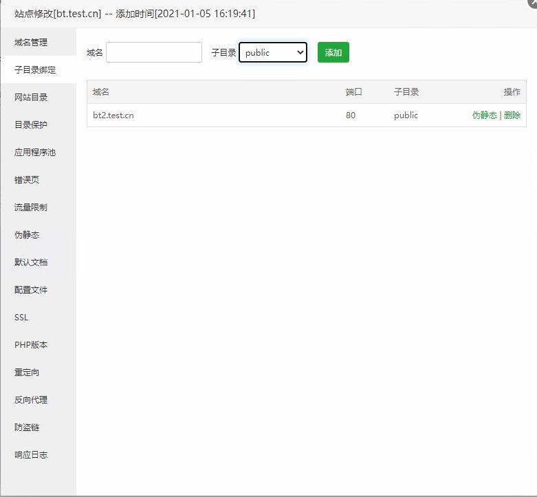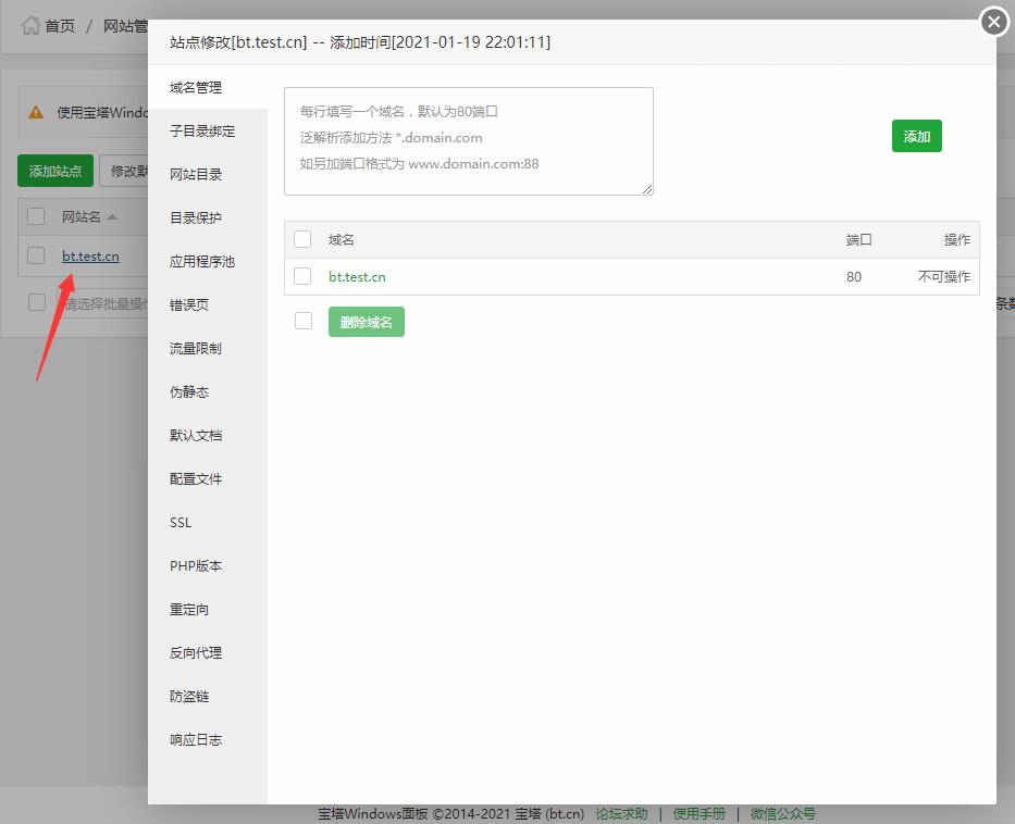 域名管理这里仍然可以添加多个域名,如果需要单个域名多个端口的话,需要修改配置文件,这边做了限制不可添加相同域名多个端口。