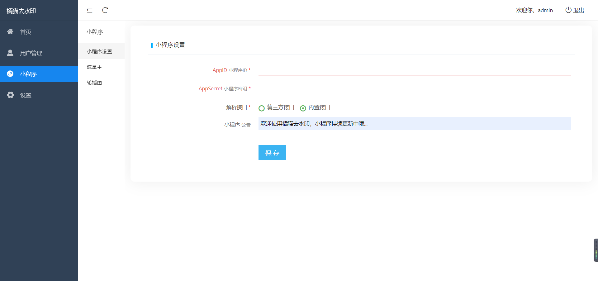 登录后来到小程序设置页面,填写 AppID 小程序ID 和 AppSecret 小程序秘钥后点击保存即可。其他信息可自行查看并填写。