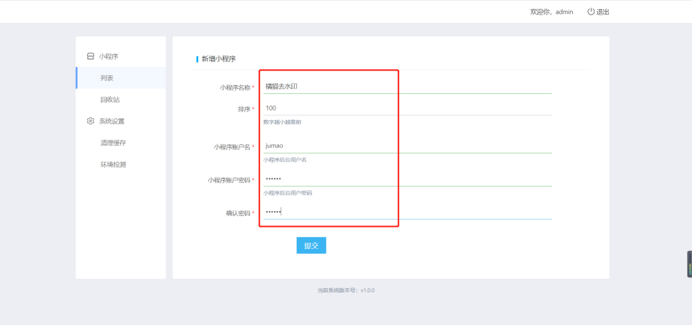填写小程序名称等,以及小程序管理端的账户名和密码。要记得账户名和密码哦,后续登录需要