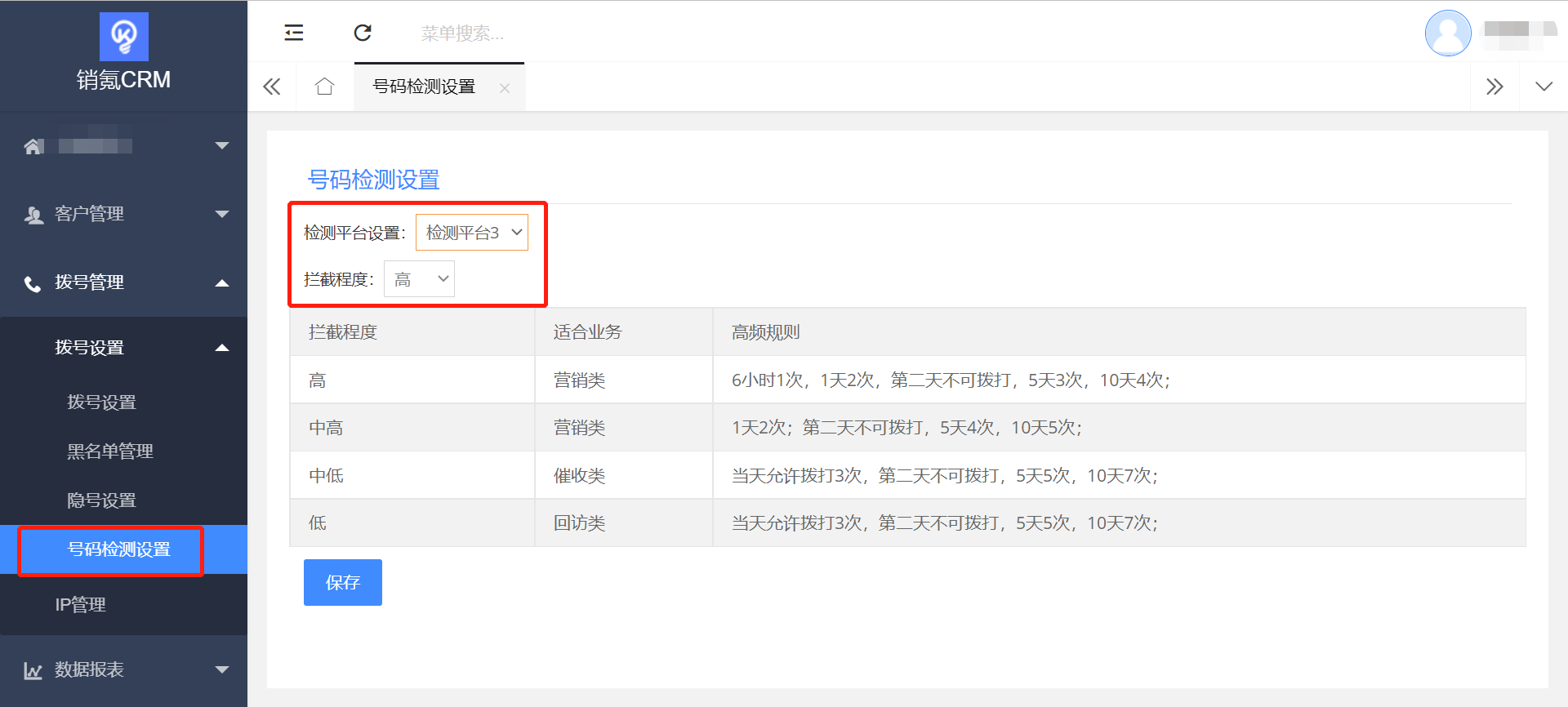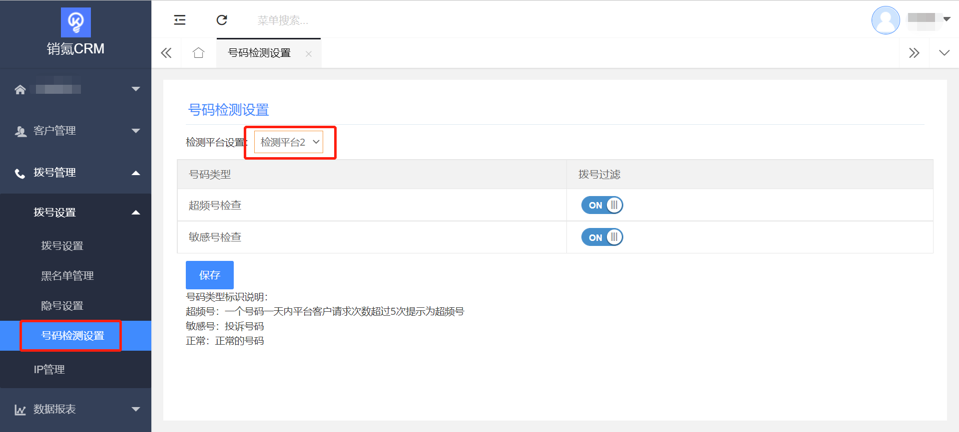 十、如果客户想减少电销卡被封的概率,需要管理员进行号码检测设置;