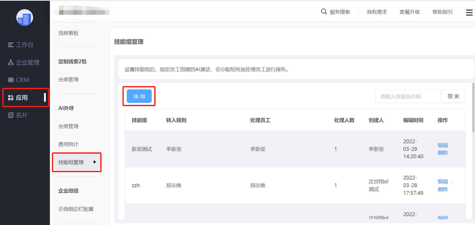 ## 三、设置技能组。将人工坐席添加到技能组内。