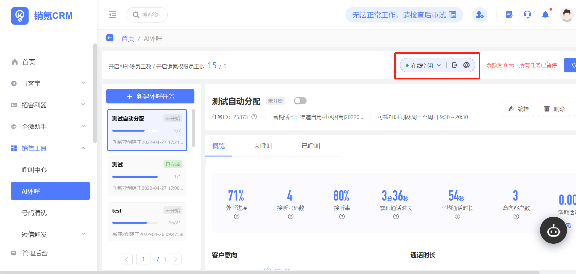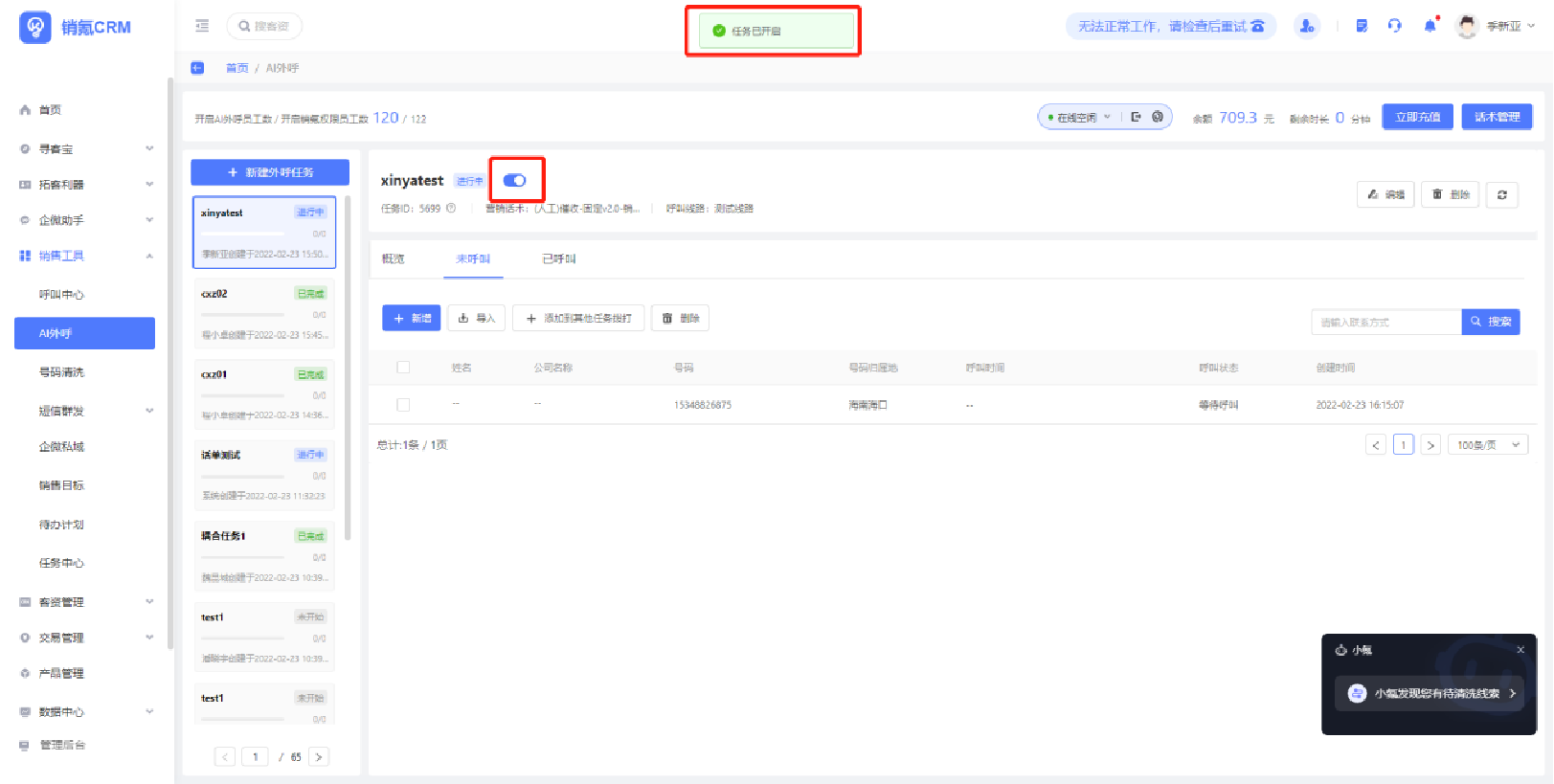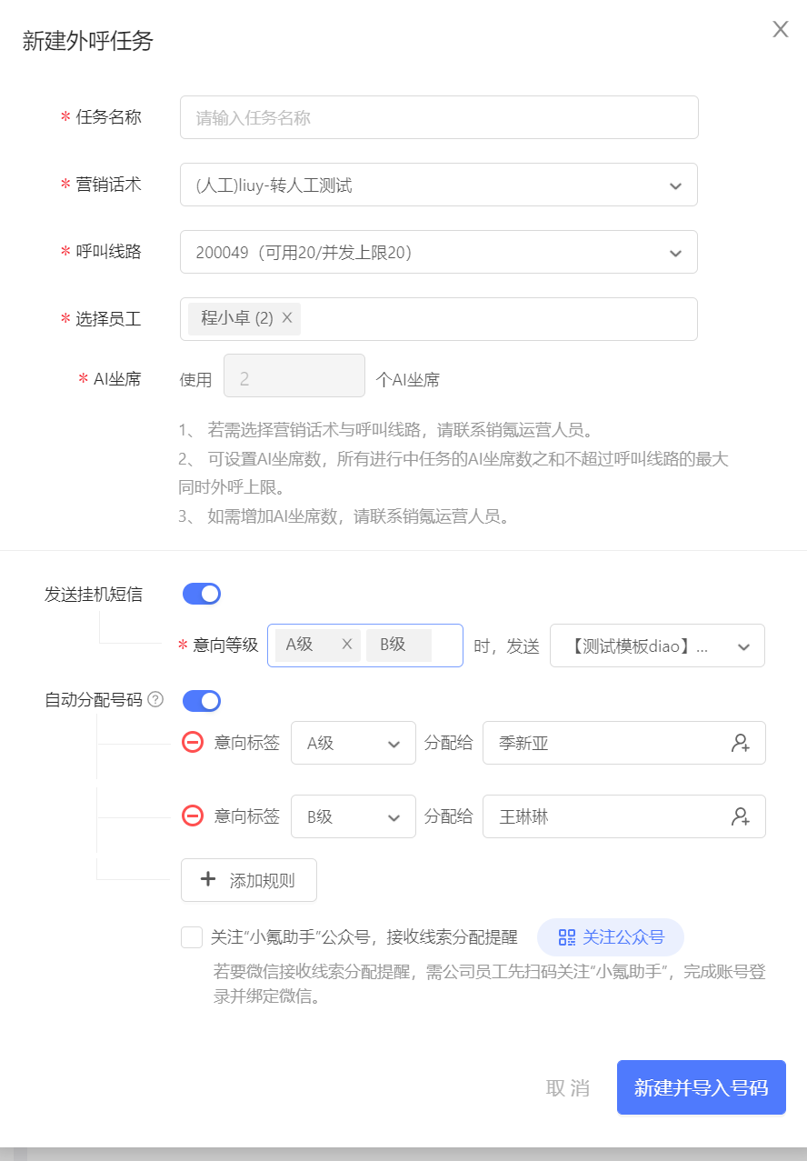 自动分配号码:开启此功能,AI外呼任务结束后,可将对应的意向标签客户自动分配给对应的员工。
