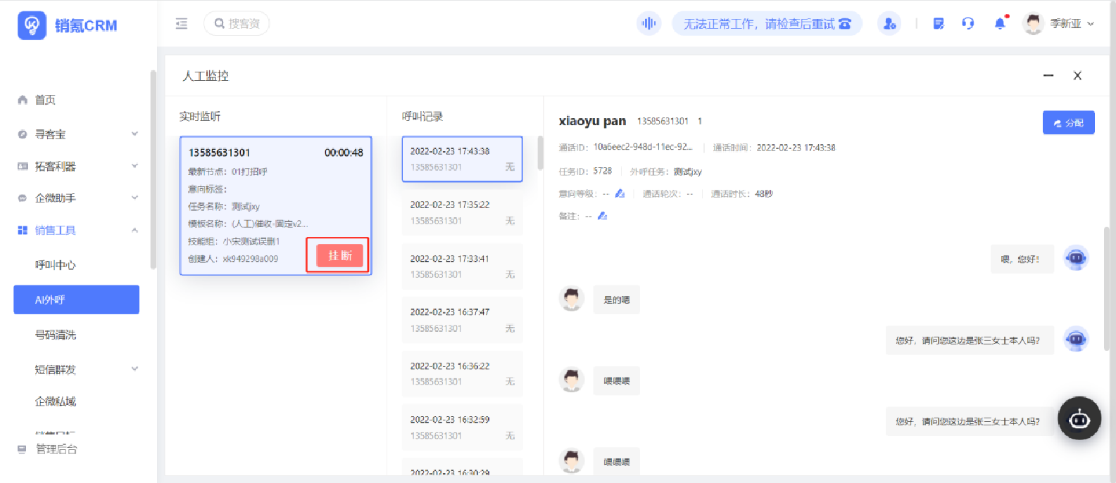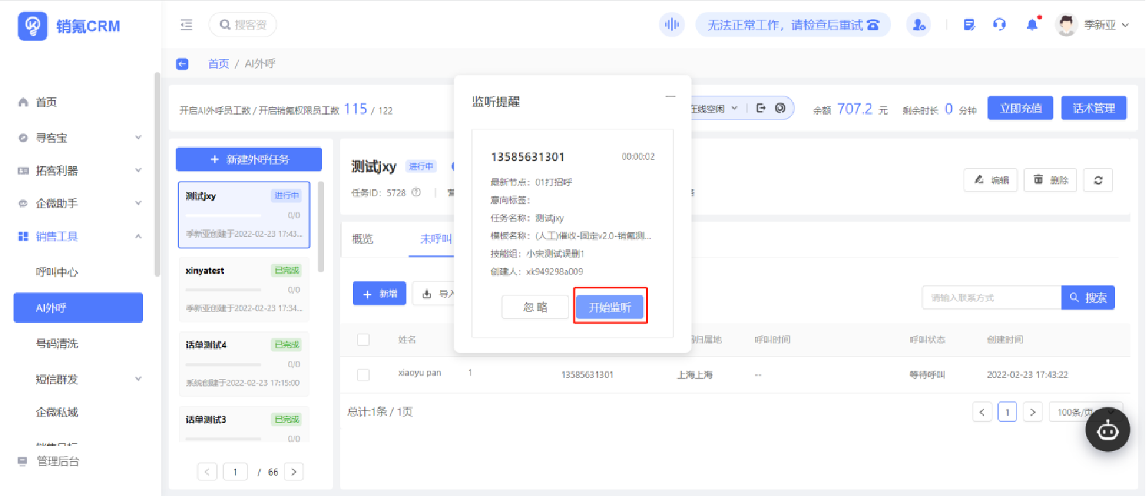 不管用户当前在哪个页面,只要对话命中话术设置好的弹屏节点,就会在当前页弹屏,点击开始监听,即可听到机器人和被叫之间的语音通话 。
