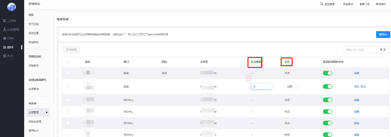 ## 二、新云后台“应用”——“AI外呼”——“坐席管理”启用分机,并分配AI坐席数。坐席数必须输入大于0的整数,分机保持启用状态 。