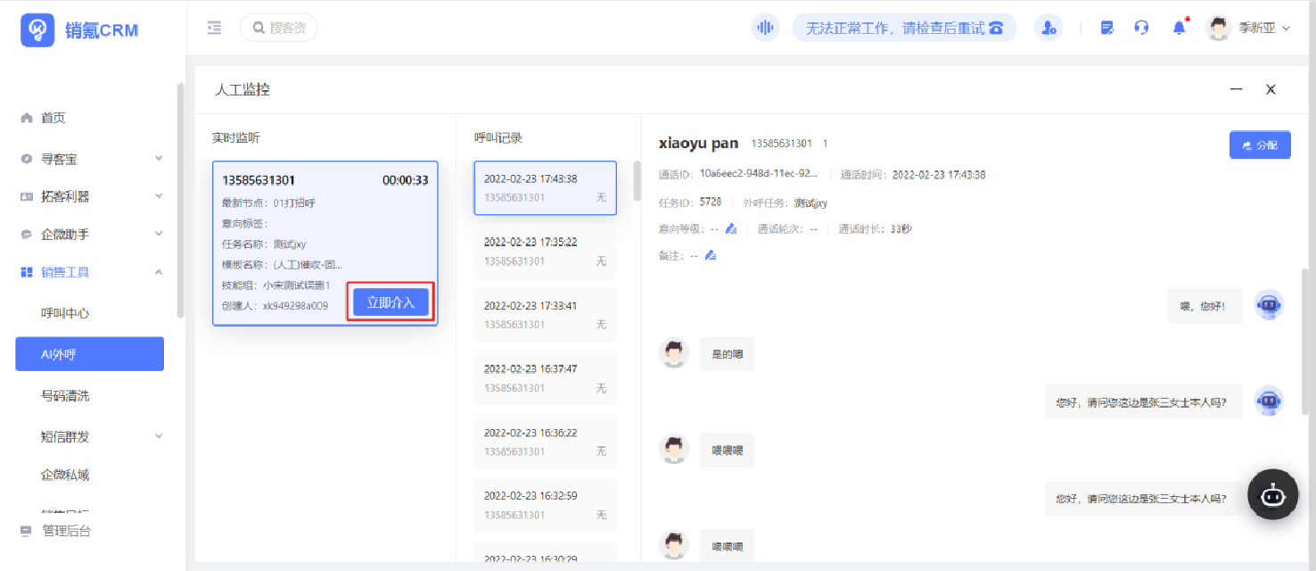 点击立即介入后,人工坐席可取代机器人和已接通的被叫进行实时交流 。