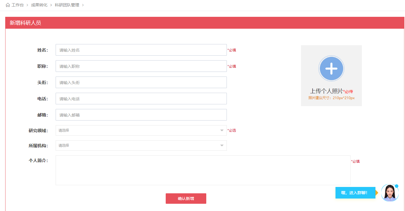 **2.新增科研人员信息**:点击列表页的“新增科研人员”按钮,进入新增科研人员信息填写界面,按要求填写好科研人员信息,点击“确认新增”按钮即可,如下图:
