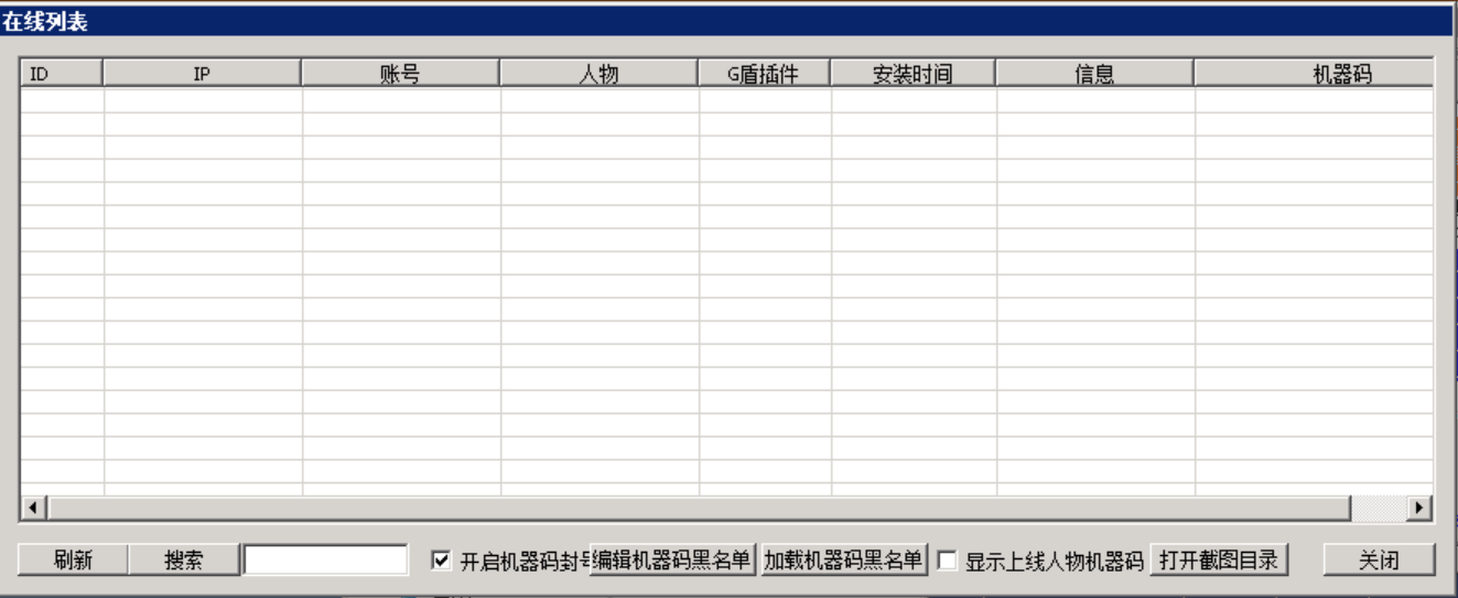 2.在线列表显示了每一个玩家的IP,账号,人物,G盾插件情况,安装时间和机器码