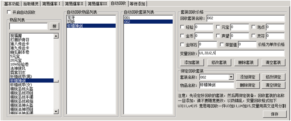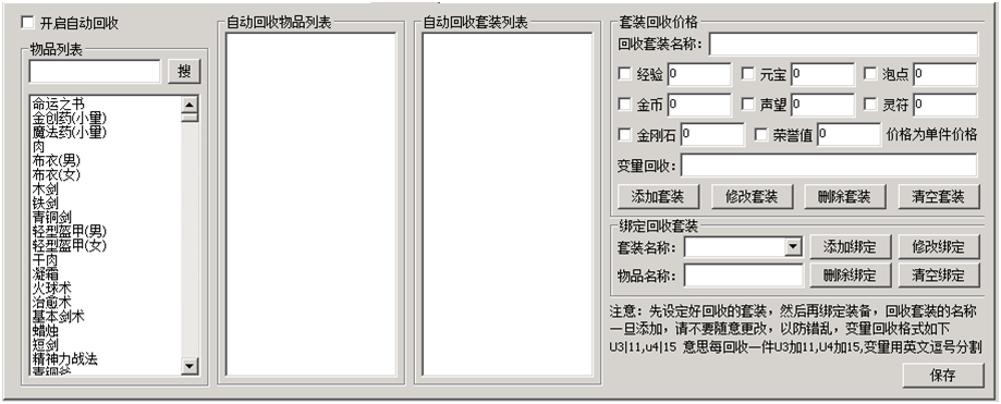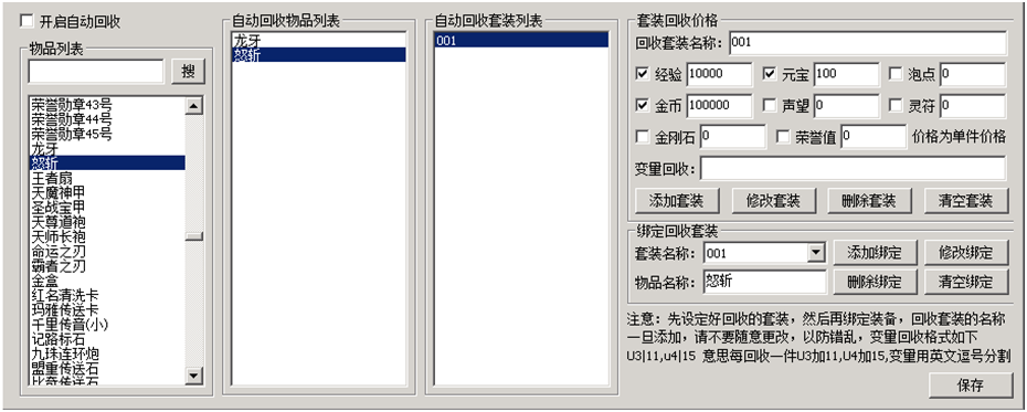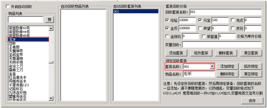 这里套装001,回收给元宝是100,意思是,龙牙回收\=100元宝,怒斩回收也是100元宝,这个设置的回收价格是每一件单件的价格。