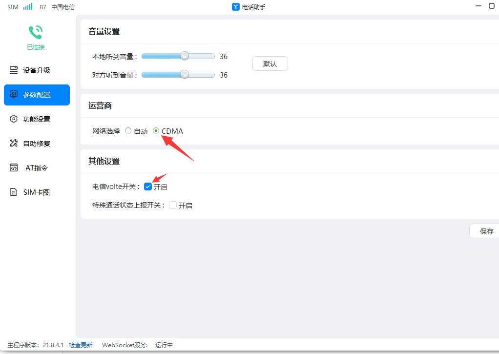 * 查看客户端的“**参数配置**”菜单,如果电信VOTLE开关**没有勾选**,说明现在手机卡语音服务通过电信2G-CDMA基站提供。