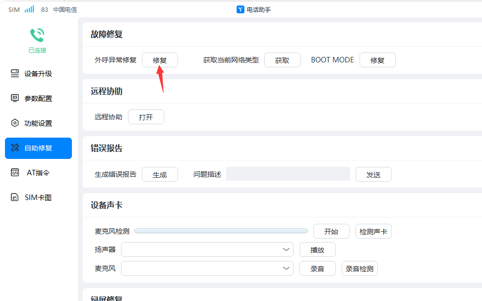 * 如果操作了电信VOTLE开关还不能解决,那就去客户端的“**自助修复**”菜单,点击**修复** “外呼异常”。如**图2**所示。