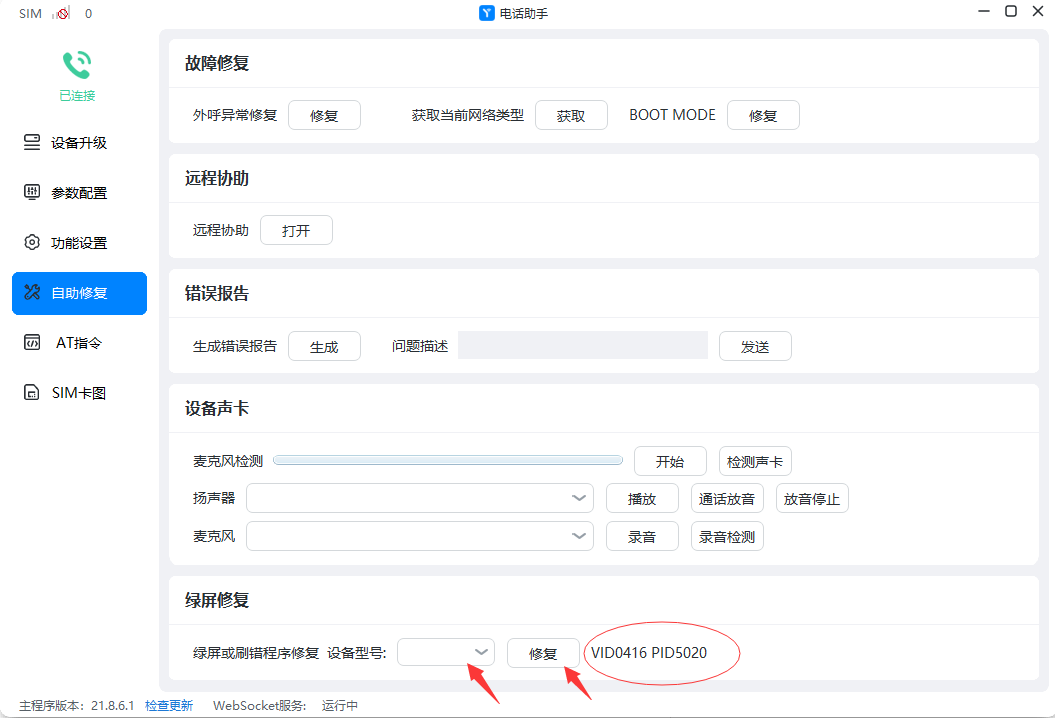2. 客户端,"自助修复"菜单,输入快捷键后出现“**绿屏修复**” ,如果有出现“**VID0416 PID0520**”据设备背面标签选择对应型号修复。
