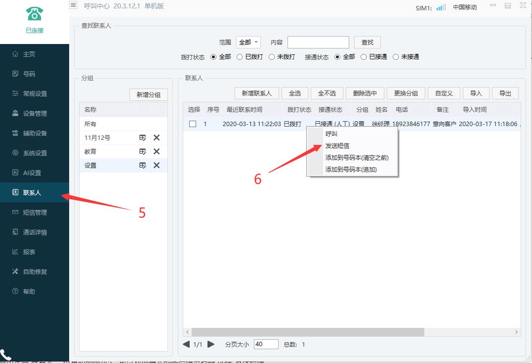 第五步,点击左侧"联系人",图示5,可以对你导入的客户信息右键 选择"发送短信"进行编辑发送,位置如图标示6.