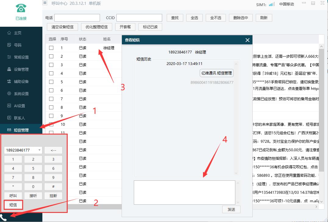 第四步,在"短信管理"界面中,双击进行查看短信并且可以编辑发送,图示3 4。