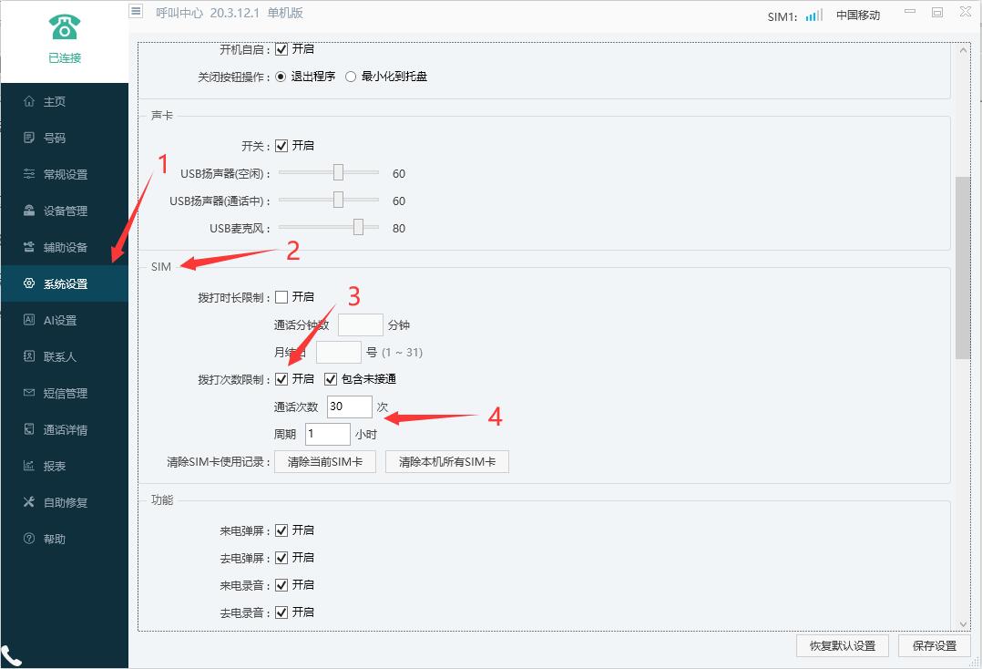 第五步,假如设置一个小时拨打30次换卡,就设置周期1小时 拨打次数30次,图示 4 具体看您需要设置几次换卡。