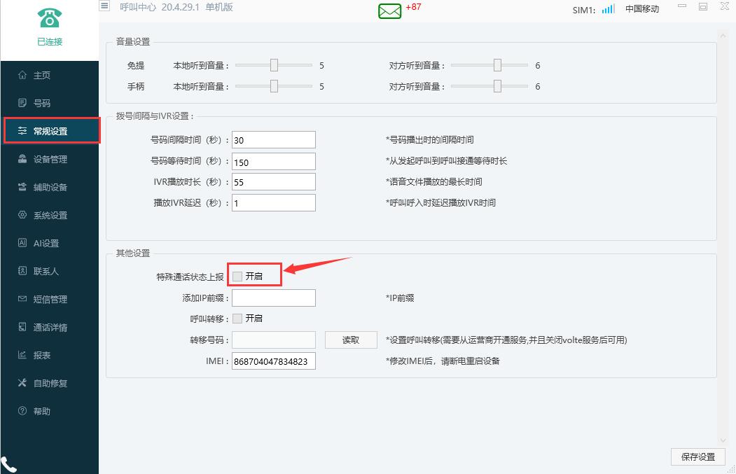 需要在常规设置开启“特殊通话状态上报" 功能!