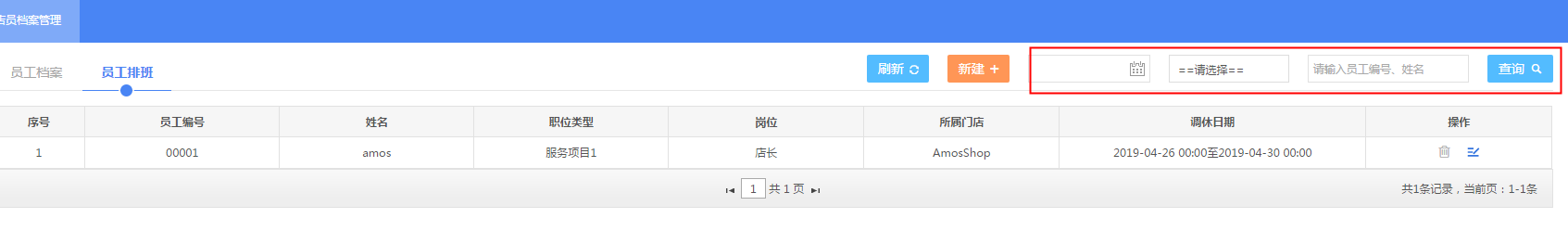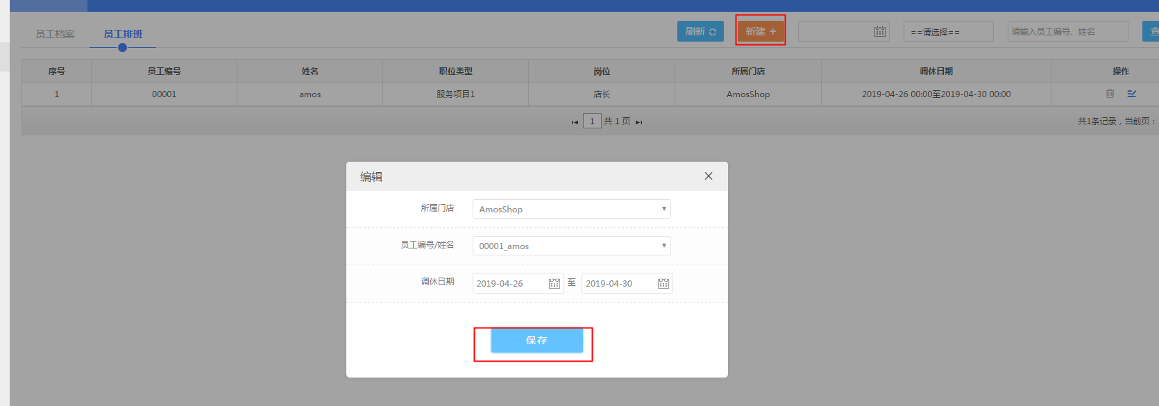 点击新建,将需要排班的员工信息录入,点击保存,排班完成;