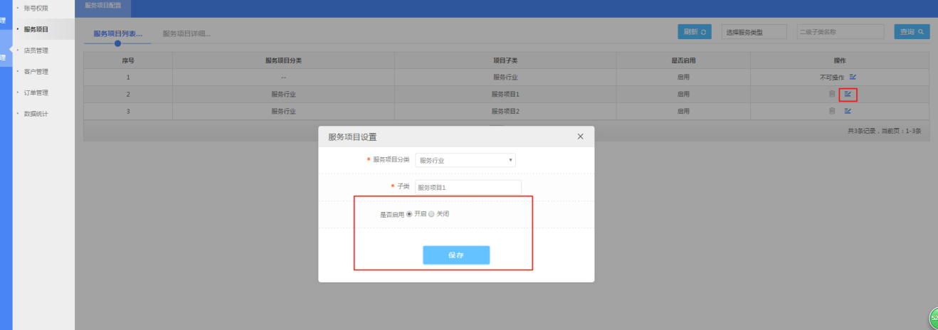 1.1点击门店管理--服务项目--服务项目列表,开启服务项目: