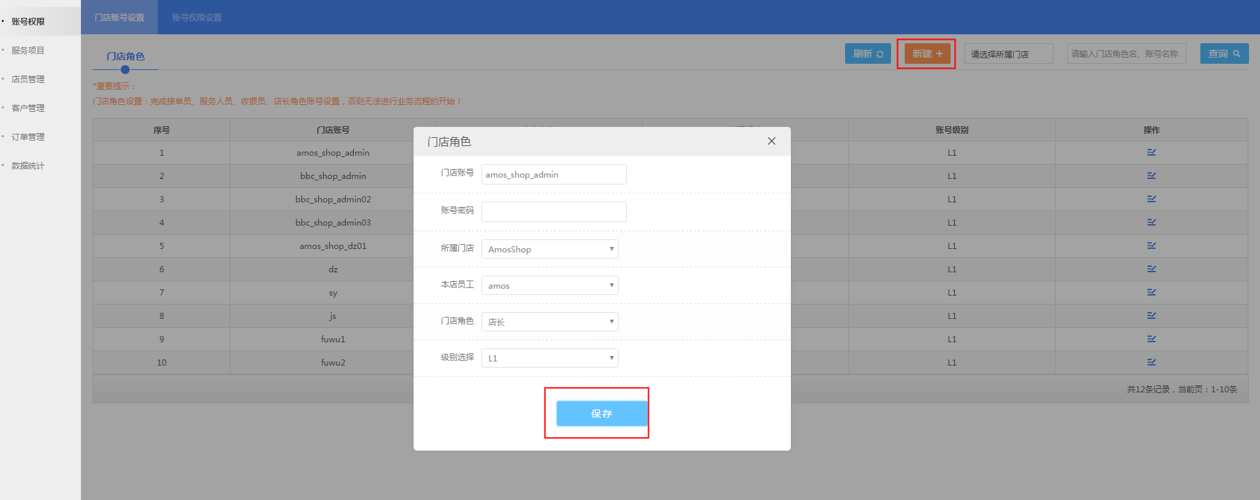 点击门店管理--账号权限--门店角色,进行添加前台用户的账号;