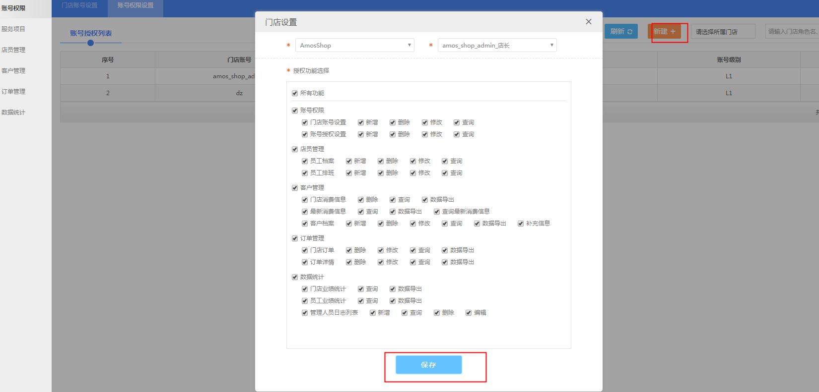 1.1点击门店管理--账号权限--账号权限设置,对账号进行权限设置;  点击新建,选择所要授权的账号,选择开通的权限,点击保存;