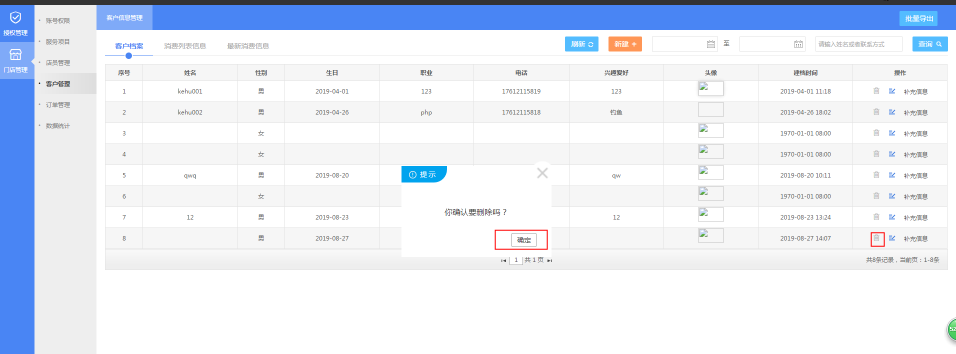 点击删除按钮,弹出页面,点击确定,即可删除成功;