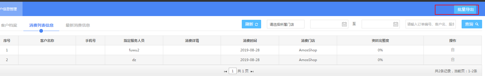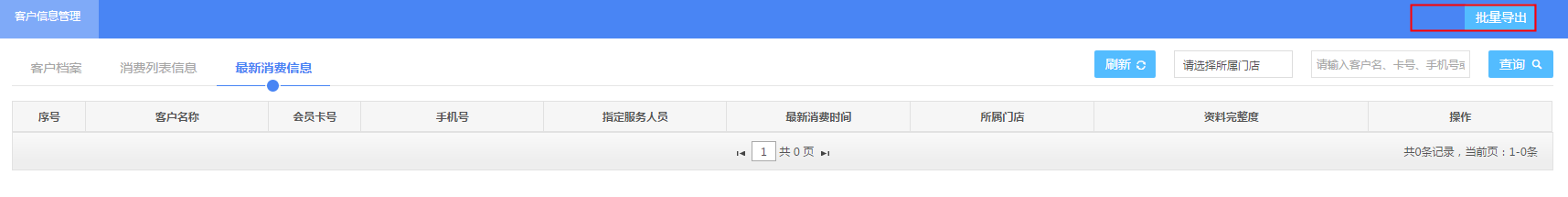 点击批量导出,将客户最新的消费记录以excel形式导出,以便于查看和统计;