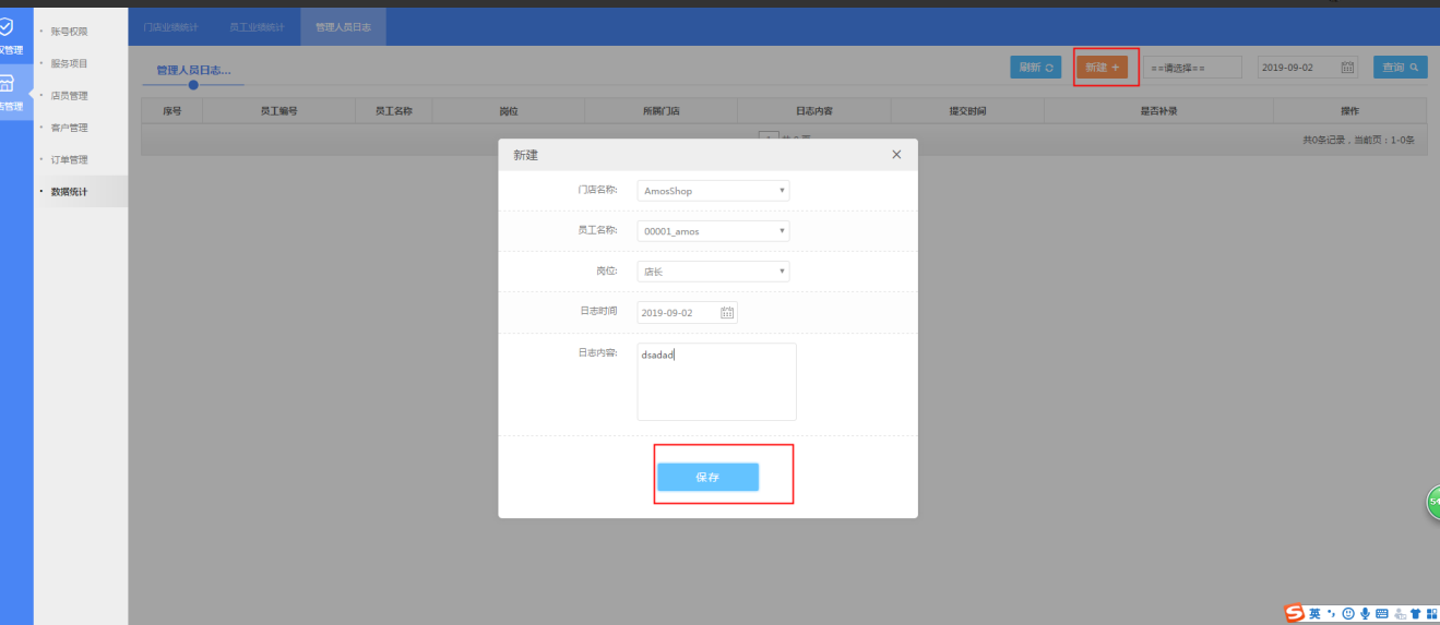 点击新建,选择门店及该门店下的员工,填写日志内容,点击保存,创建成功;