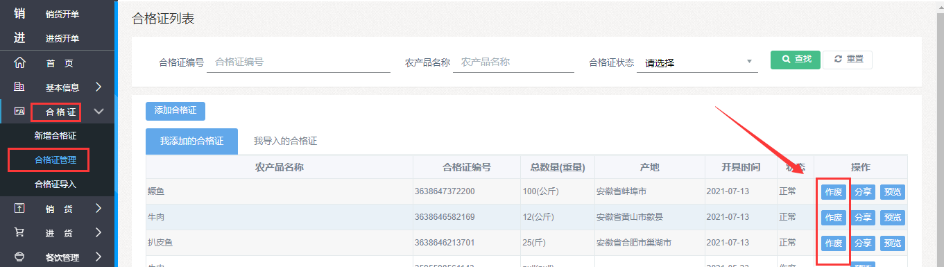 点击“合格证”—“合格证管理”—“作废”—“确定”,即可作废该合格证。