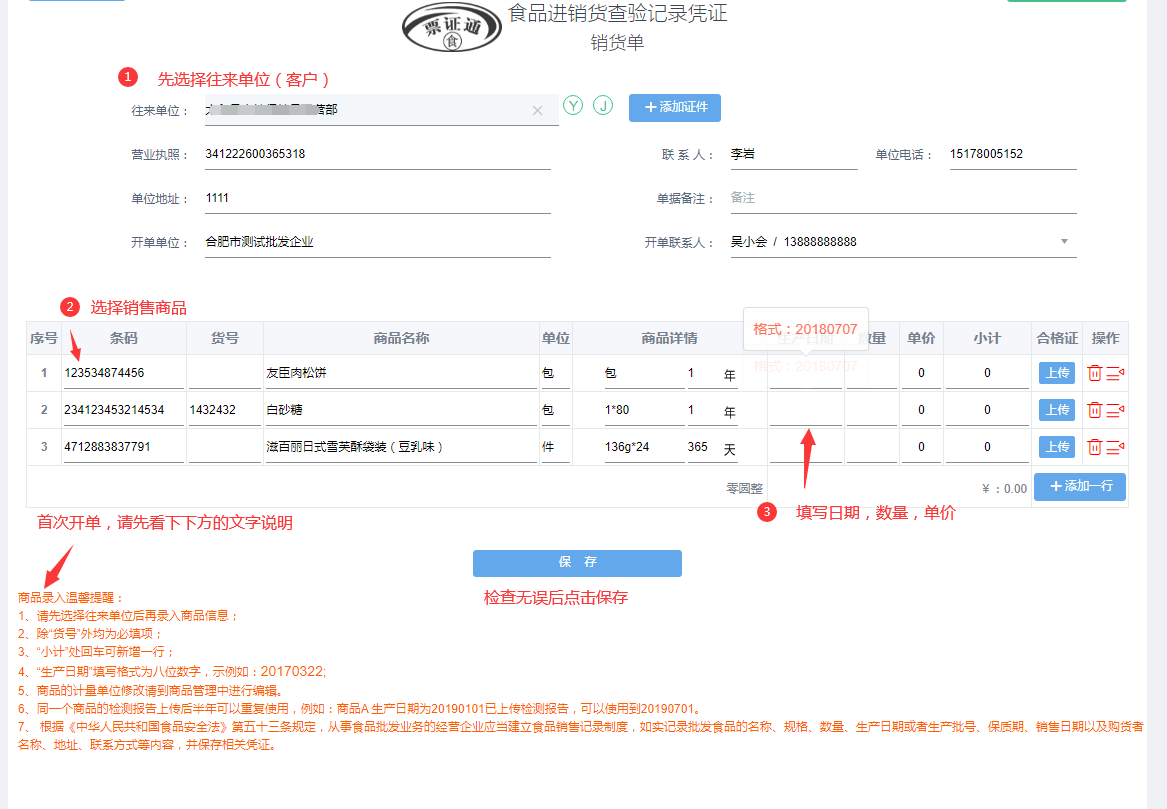 先选择客户单位,再选择销售的成品,填写生产日期、销售数量、单价,查看检测报告是否上传,全部信息检查无误后,点击保存。