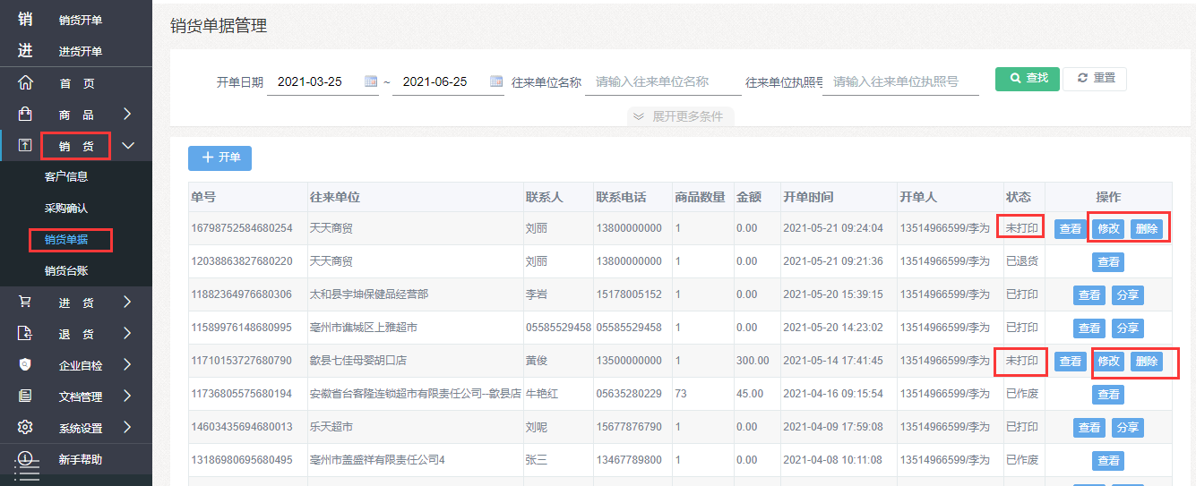 销货单操作:点击“销货”—“销货单据”—“修改”/“删除”