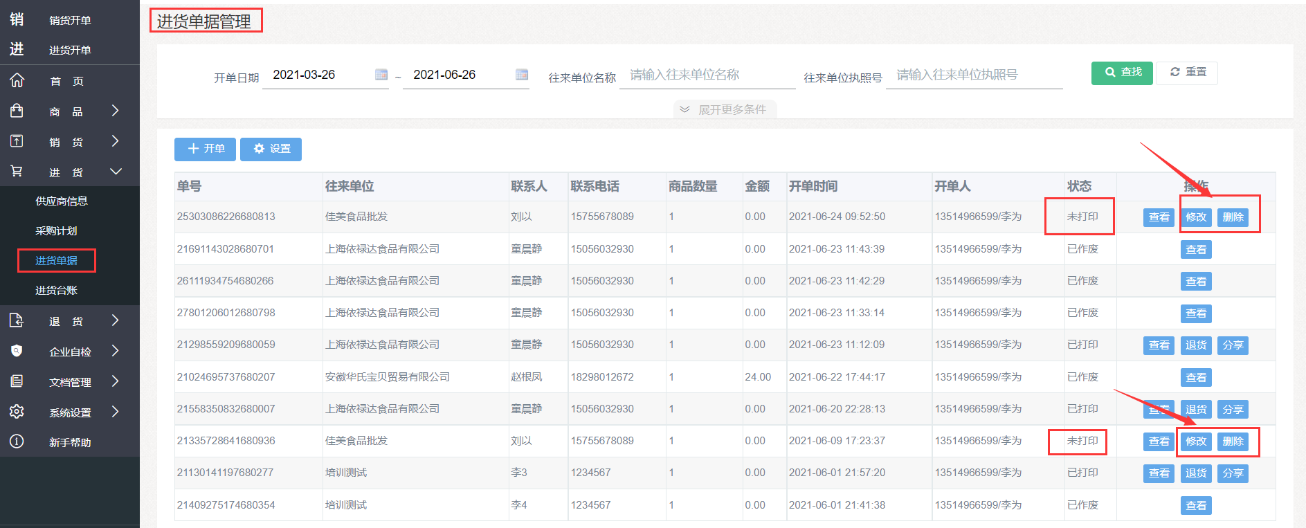 单据在打印或者生成台账之前(状态为未打印),可以修改与删除。
